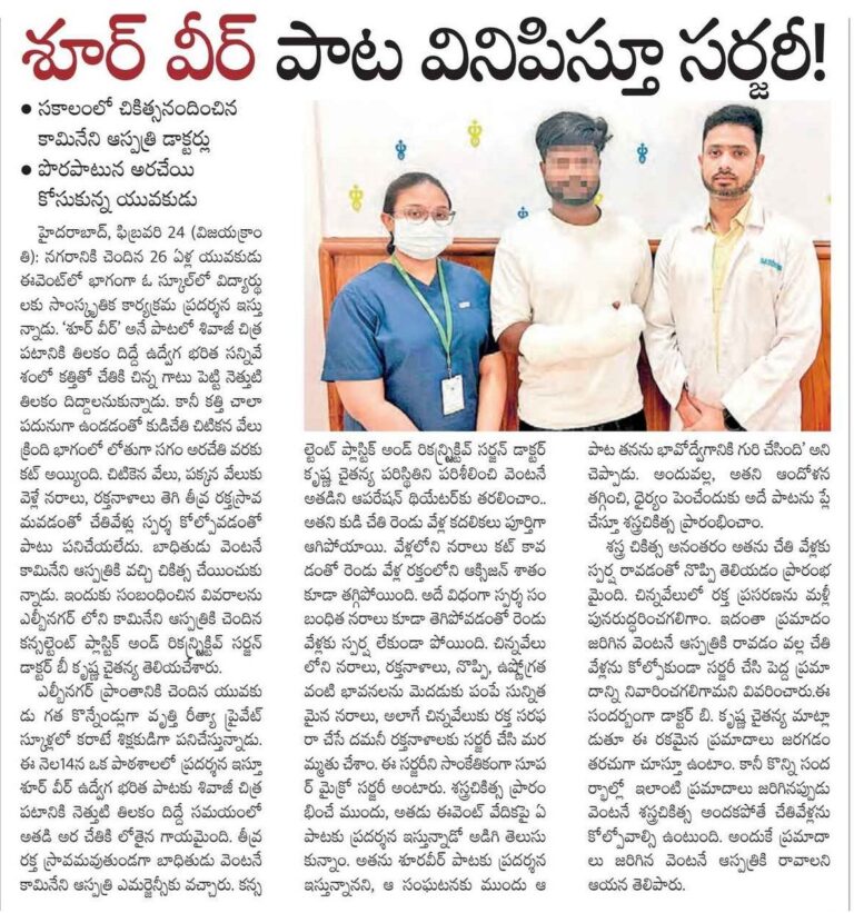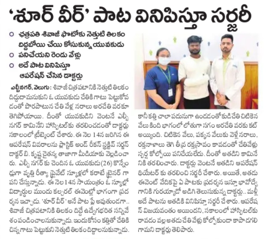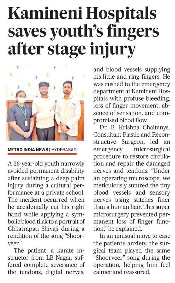 On arrival, the emergency team acted without delay. Led by Dr. B. Krishna Chaitanya, Consultant Plastic and Reconstructive Surgeon, the patient was taken for emergency super microsurgery. Using an operating microscope and ultra-fine sutures, the surgical team carefully repaired the severed arteries, tendons and sensory nerves, restoring blood circulation and preserving finger function.