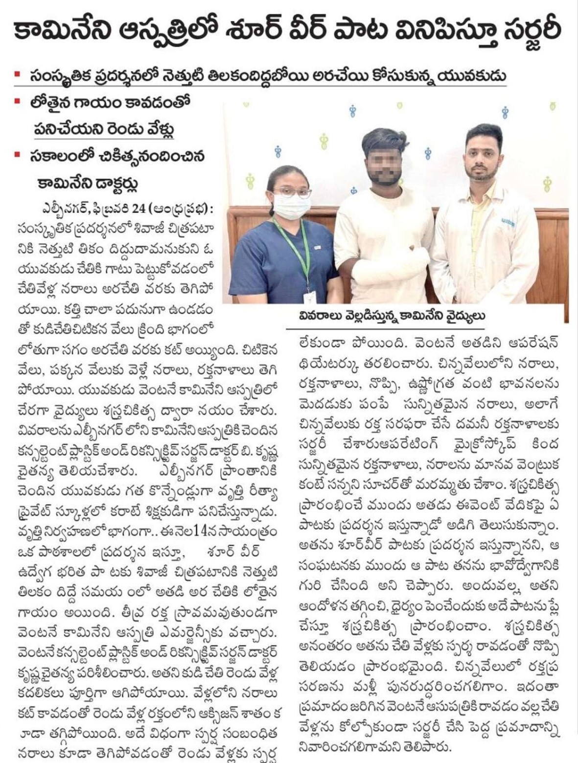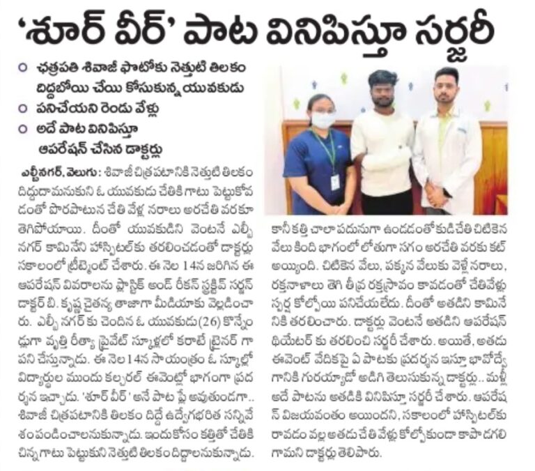 A cultural performance took an unexpected turn when a 26-year-old karate instructor sustained a deep cut to his right palm while attempting a symbolic blood tilak during an emotional rendition of the “Shoorveer” song. The injury was severe, damaging digital nerves, tendons and blood vessels supplying the little and ring fingers, leaving two fingers immobile with heavy bleeding and loss of sensation.